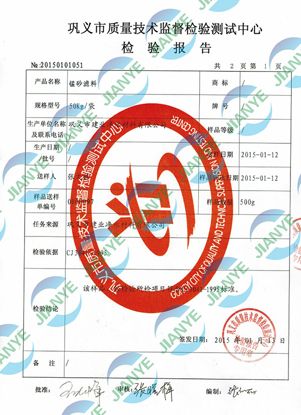 2020錳砂第三方檢測報告【建業(yè)凈水】